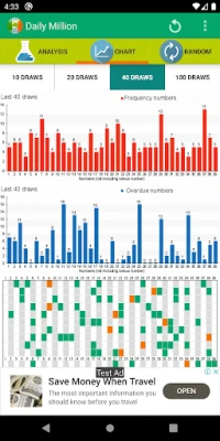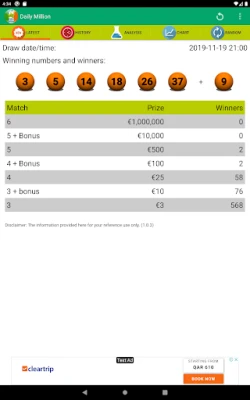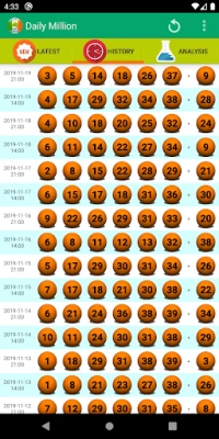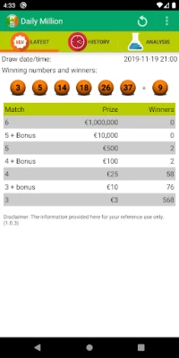 Daily Million provides a comprehensive and statistical information together with below features: - Latest Draw with winning numbers and prize - Latest Draw alert - Frequency and overdue numbers chart - Distribution chart