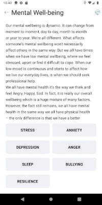 Benefits: The app helps cut through the amount and complexity of information about welfare and well being topics and delivers a refined list of contacts for accessing ongoing support