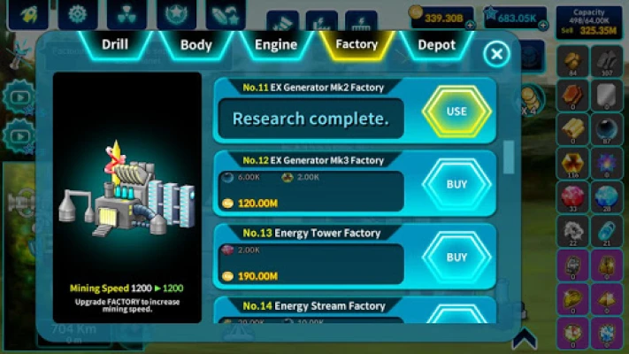 FACTORY: This is where you extract Minerals from ore. Upgrade Factory to increase mining speed.