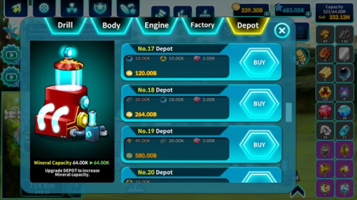 DRILL: The main mining device. The deeper you dig, the more Mineral types you'll find.