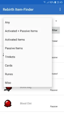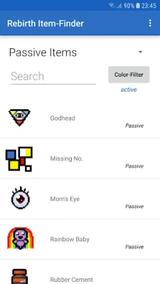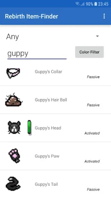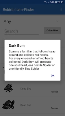 You can filter the items by color if you don't know the name. You can also select the category (Activated Item/Trinket/Card etc.) or search the item by name. Once you click on an item a description, stating the effect of the item, is shown. Additionally, you see the number of rooms you need to fully charge your item (if applicable). The DLC "Afterbirth" is supported too.