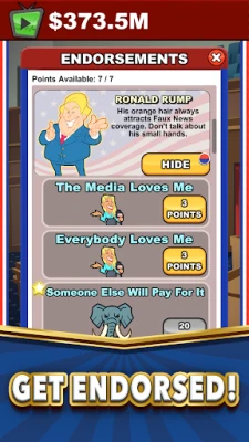 Rise through the political ranks one position at a time, gain endorsements from the biggest politicians around, and watch your lobbies earn billions towards your campaign! Can you lead the most profitable political campaign in the universe?
