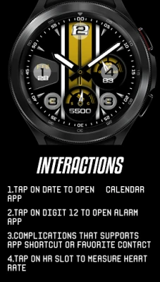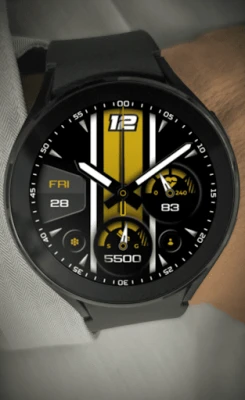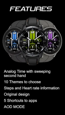 .Stripes - Analog watch features: .Analog time with sweeping seconds hand .Steps and heart rate information with visualizers .High quality and original design .10 themes to choose .5 interactions (1.tap on date to open calendar app, 2.tap on digit (12) to open alarm app, 3.tap on two complications to set your favorite app shortcut or your favorite contact 4.tap on HR slot of the watch face to open heart rate) .Supports AOD with themes