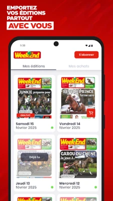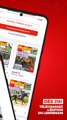 Profitez des avantages de Week End sur votre téléphone / tablette: • Prenez une longueur d’avance : chaque numéro de Week End est disponible la veille de sa parution en kiosque dès 21h00, heure de Paris. • Economique : Pour 0,99€ par numéro, vous bénéficiez d’une édition conçue pour profiter pleinement de possibilités offertes par votre terminal et adaptée à son ergonomie. • Pratique : Les parutions, une fois téléchargées, sont consultables partout, même hors connexion
