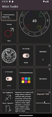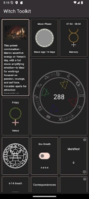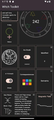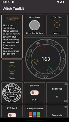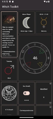 Other included tools are a magical compass positioning the elements and zodiac signs, useful for ritual work; correspondences and easy-to-understand astrological archetypes; meditation widgets that vibrate your phone in time with common breath patterns; a Chaldean and Pythagorean gematria calculator; a manifestation aid; and more.